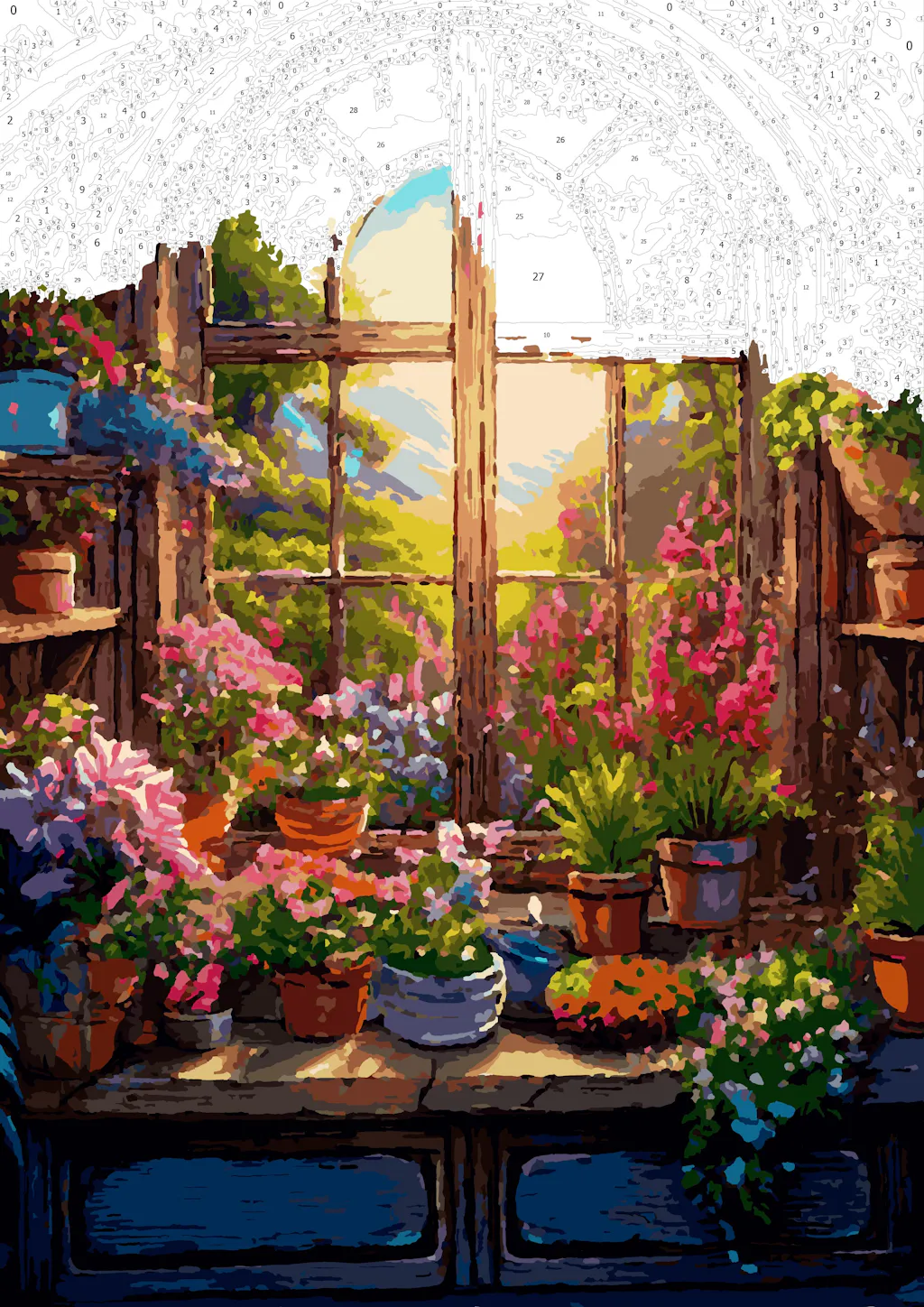Ein Fenster zur Natur und zur inneren Ruhe – dieses zauberhafte Motiv entführt dich in einen blühenden Rückzugsort. Die warme Abendsonne strahlt durch ein antikes Fenster, eingerahmt von einer Fülle lebendiger Blumen und Pflanzen. Jeder Topf erzählt eine Geschichte von Wachstum und Harmonie, während der Blick nach draußen zum Träumen einlädt. Das Malen dieser friedlichen Szene wird zu einem meditativen Erlebnis, das dich den Alltag vergessen lässt.